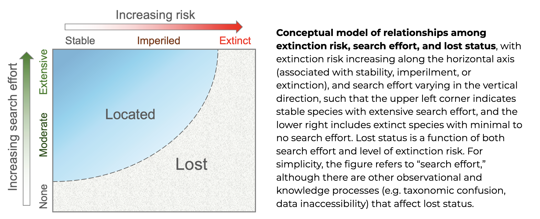 LOST species are those that have not been detected in the wild for at least ten years*. Whereas terms such as stable, imperiled, and extinct are indications of biological status, the designation of lost involves the outcome of both biological and observational processes (see figure above). The status of lost can be associated with rarity and decline, but also with low detection probability, low search effort, or a lack of information. Thus, being lost by itself does not inherently reflect extinction risk, just as the ability to locate a species (i.e., detect it in the wild) does not necessarily imply a specific risk level. Nevertheless, a species that has not been seen in ten years despite intense search effort is likely of greater conservation concern than a species that has been the focus of only minimal search effort. Thus, the designation of lost, when coupled with extensive search effort, has the strongest conservation relevance (see Author Guidelines for reporting requirements on search effort).